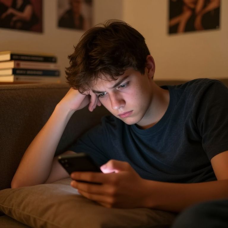 Annoyed teenager scrolling on smartphone, slouched posture on a couch, cozy room with books and posters, warm lighting, capturing teenage boredom and irritation in detailed manner