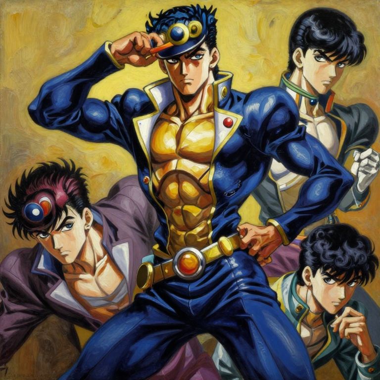 Portrait of the technological hacker magician in a dramatic jojo pose, golden blue outfit, oil on canvas by dave mckean, masmaune shirow and ryuichi sakamoto
