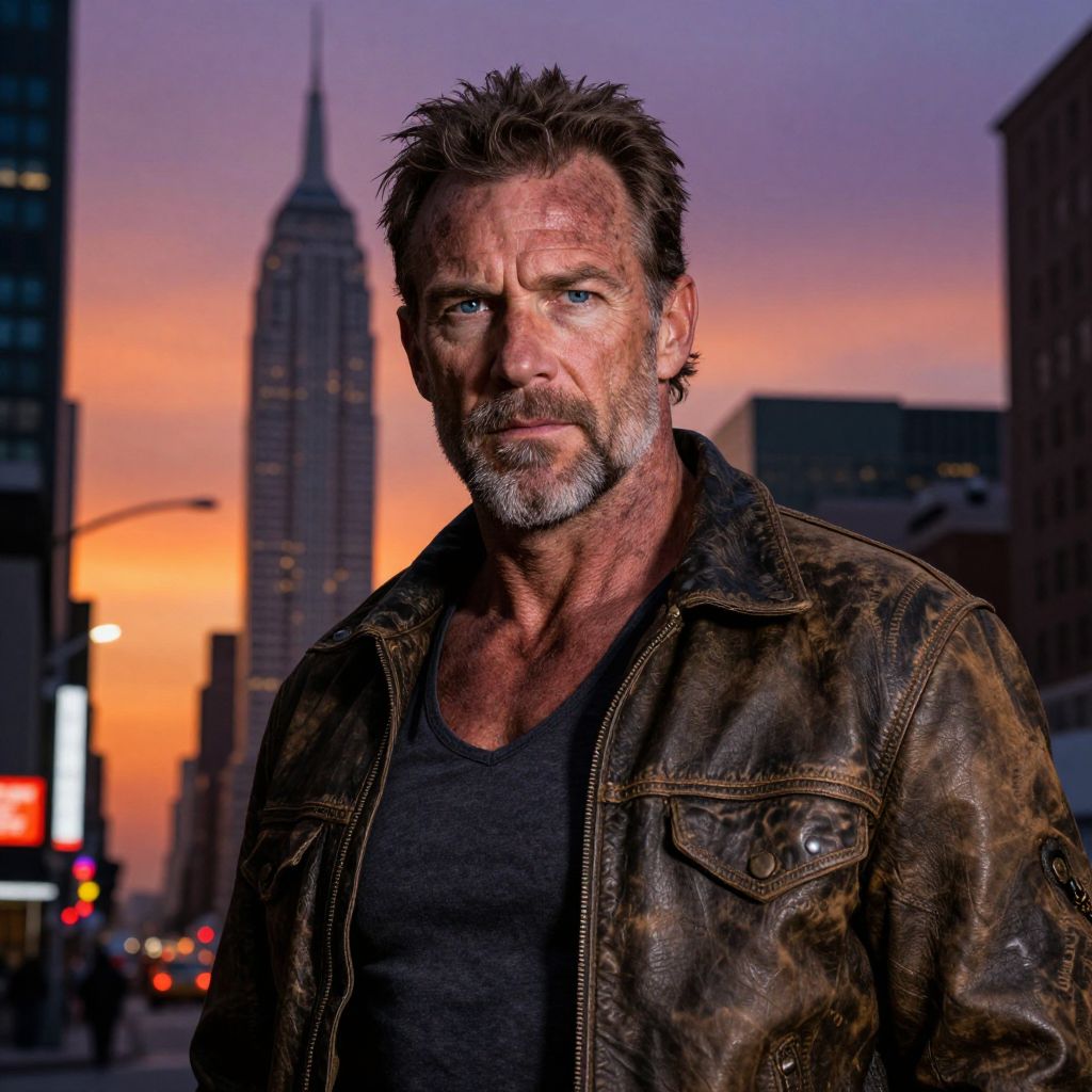 Photograph of a rugged, middle-aged man with messy brown hair and a graying beard, standing in an urban setting at sunset. He wears a worn, brown leather jacket over a dark gray t-shirt, exposing a muscular, tanned chest. His intense blue eyes gaze directly at the camera. The background features a cityscape with the iconic Empire State Building silhouetted against a vibrant orange and purple sunset sky. Blurred streetlights and buildings add depth to the scene. The man's expression is serious and determined.