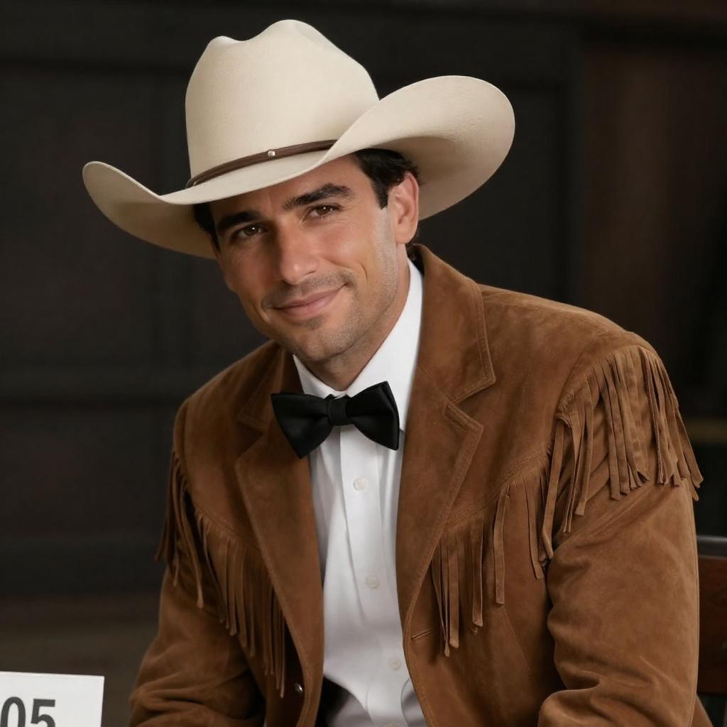 Photograph of a smiling man in a black cowboy hat, black suit, and white shirt, standing behind a white table. The background is a blurred, sunlit beige wall. The man's hat has a wide brim, and he has a light complexion. The image has a warm, slightly overexposed tone.