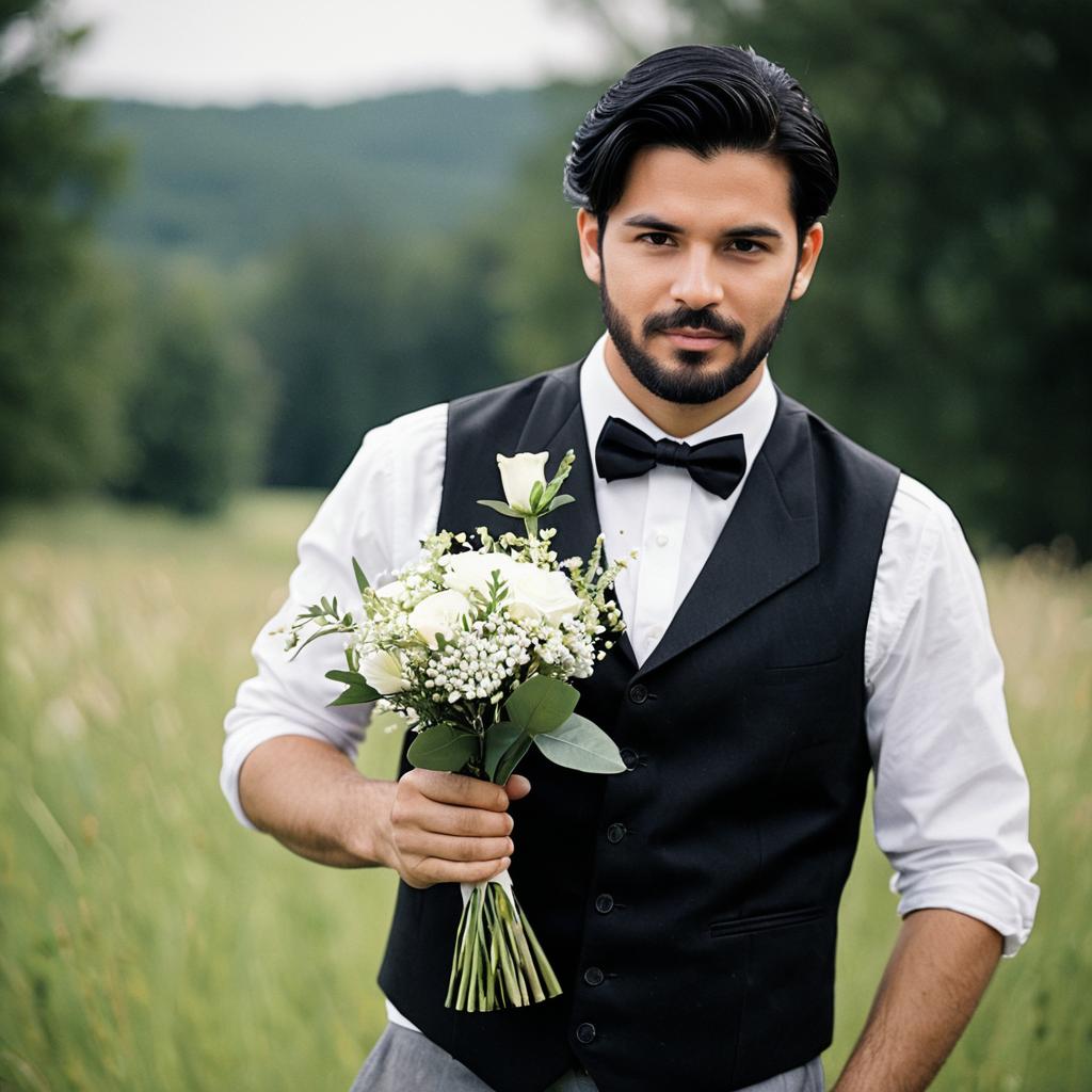 Portrait of a young man with black hair and a beard wearing a black vest, white shirt, and black bowtie, holding a white floral bouquet outdoors in a blurred natural background, suitable for a country wedding theme.