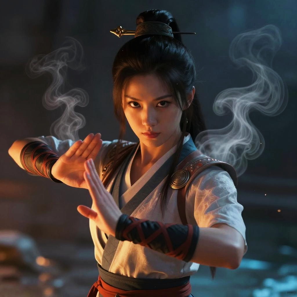 Photorealistic digital artwork of an Asian woman with black hair in a bun, wearing traditional white and red martial arts attire, hands glowing with smoke,