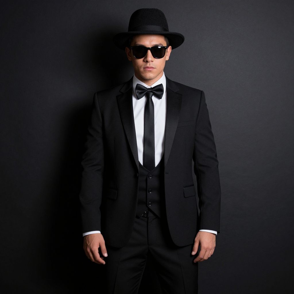 Nightclub singer costume, 1boy, solo, male focus, hat, pants, shirt, necktie, sunglasses, jacket, spotlight, vest, white shirt, black bow, black bowtie, bow, bowtie, black necktie, suit, black jacket, black pants, arms at sides, collared shirt, standing, formal, looking at viewer