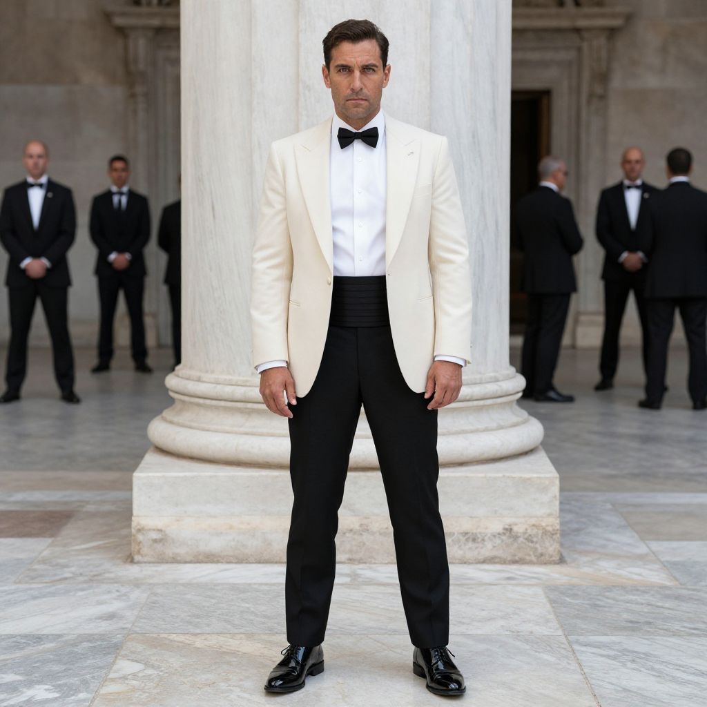 Photograph of a serious-looking man standing in front of a tall, white marble column in a grand, marble-floored hall. He wears a white tuxedo jacket with black bow tie, white dress shirt, and black dress pants, paired with polished black dress shoes. His dark hair is neatly styled. In the blurred background, four men in black tuxedos stand, facing the camera. The hall has large stone walls and a polished marble floor, with soft natural light illuminating the scene. The man's stance is confident, with hands relaxed by his sides.