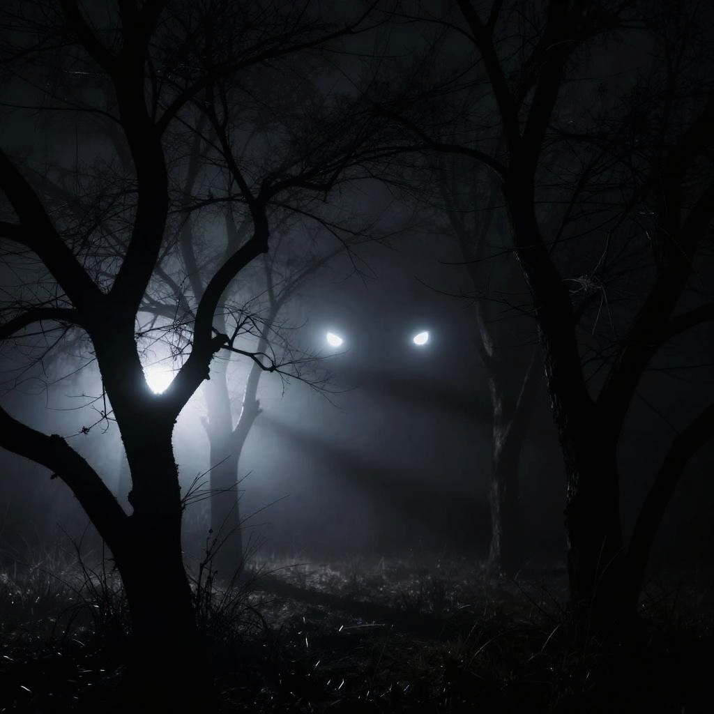 Spooky black background featuring eerie glowing eyes peering through dense fog, twisted barren trees casting long shadows, illuminated by a faint ghostly light, creating a chilling and mysterious atmosphere.