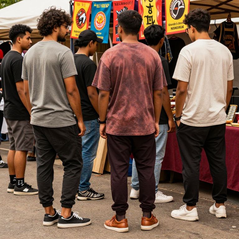 Casual street outfits captured in a weekend market corner, people dressed in faded band tees, comfortable joggers, and leather sneakers, colorful banners, warm tones, grounded and relatable atmosphere, Dall-E style.