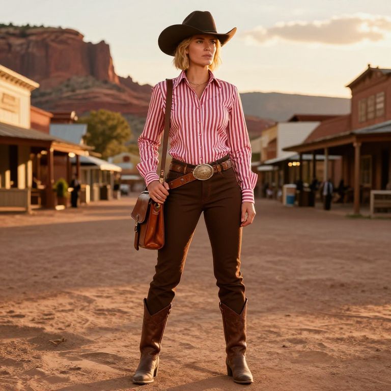 A confident female cowboy standing in a sunlit Western town square, wearing a classic female cowboy outfit featuring brown pants, brown leather boots, and a red and white striped shirt. She has short, sun-kissed blonde hair, a determined expression, and a leather satchel slung over her shoulder. The background shows a backdrop of red rock cliffs and a distant horizon with a golden sunset, adding a warm, adventurous atmosphere.