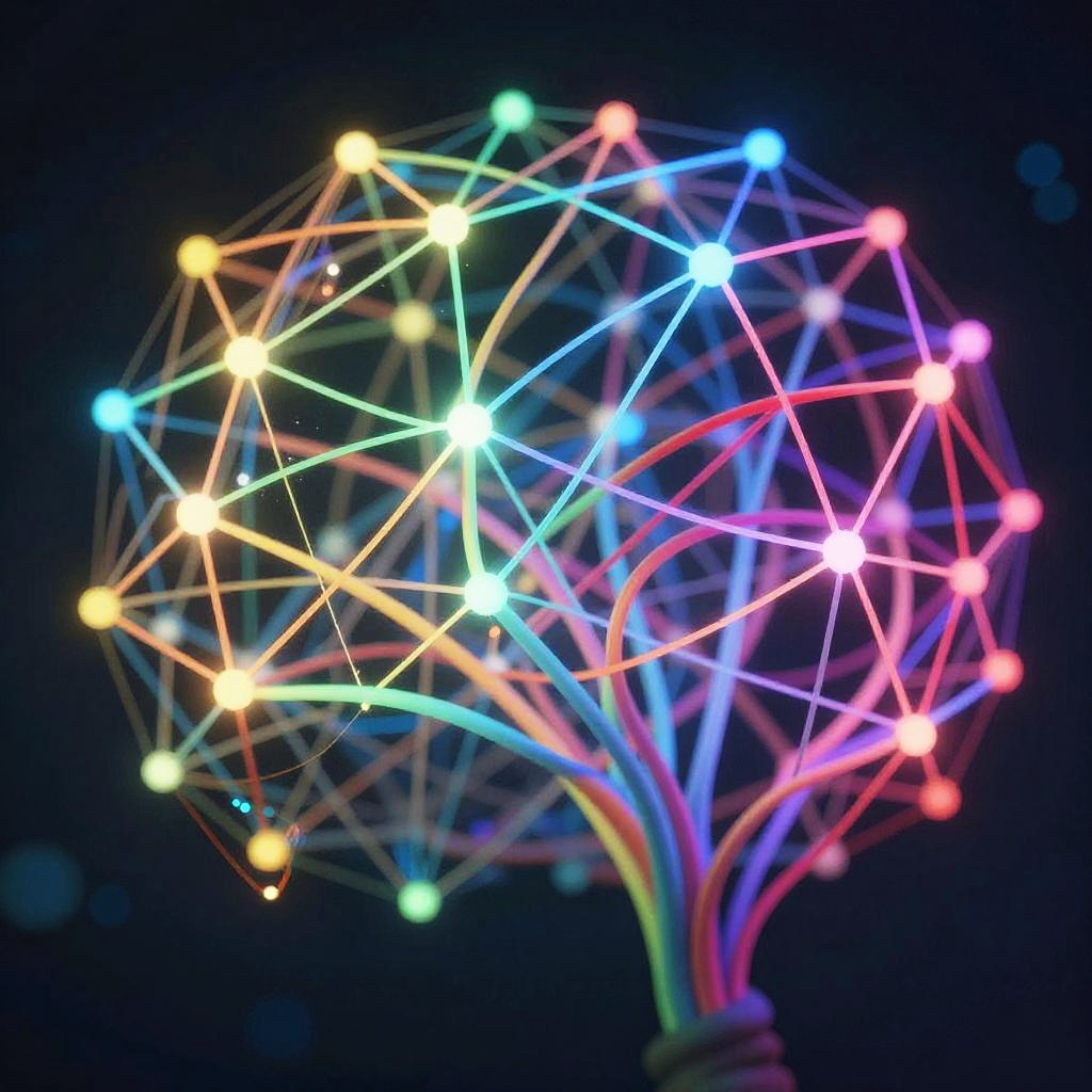 Close-up of ai generated picture maker algorithm visualized as abstract neural network with colorful data streams, intricate geometric patterns, glowing nodes interconnected, digital art creation process illustrated, dynamic and vibrant, technology and creativity fusion