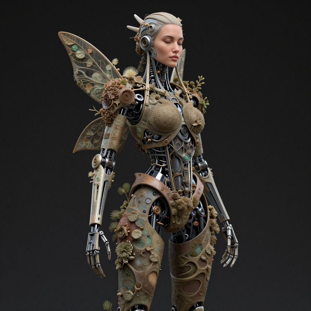 A highly detailed, biomechanical woman robot adorned with botanical elements, resembling a cybernetic dryad, stands against a dark background, showcasing intricate detailing and a fusion of organic and mechanical components.