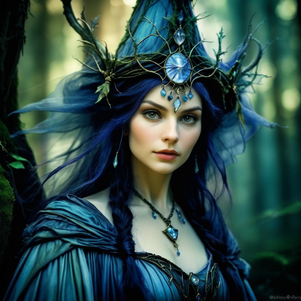 Close-up portrait of a mystical sorceress with captivating blue eyes and flowing dark hair with blue highlights, wearing an elaborate crown adorned with leaves and a large blue gem. She is dressed in an ethereal blue gown featuring ruffled sleeves and detailed jewelry with blue gemstones. The background depicts a misty enchanted forest with softly diffused cinematic lighting.