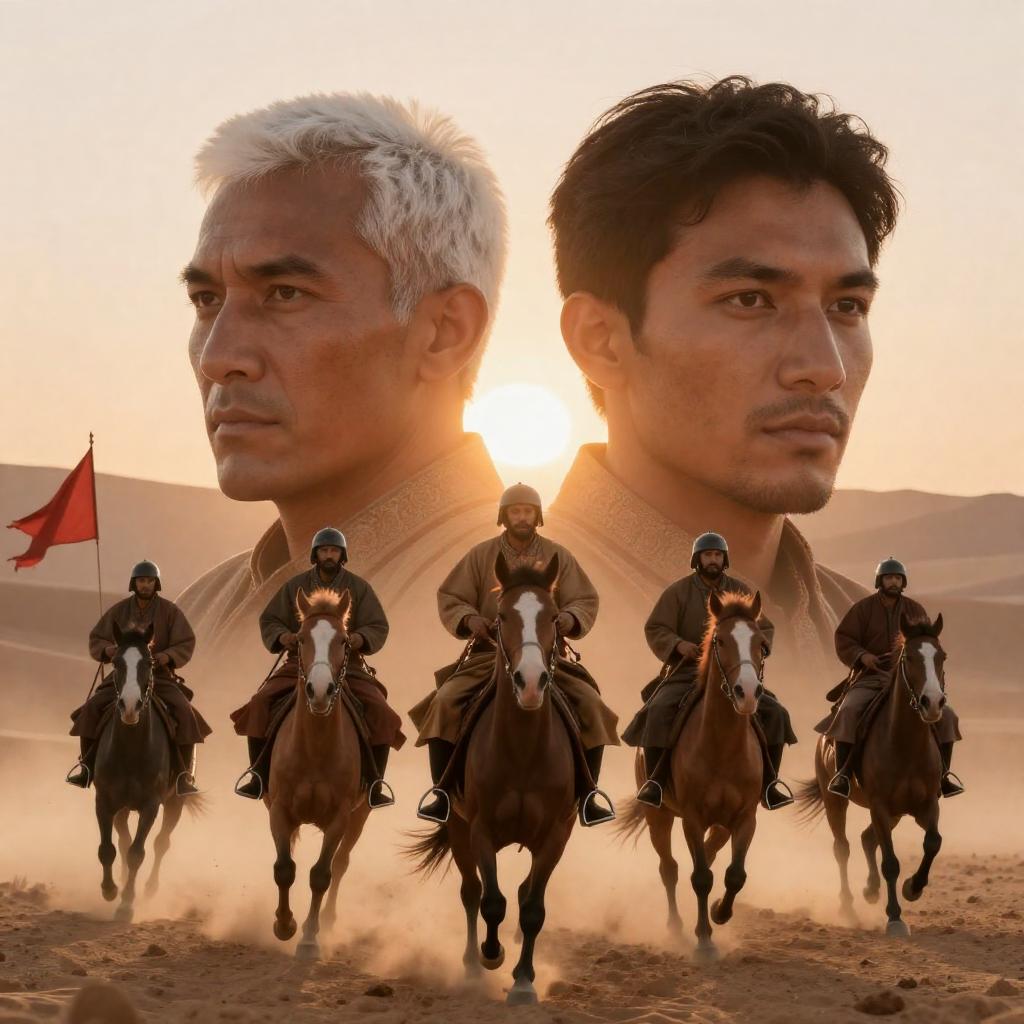 Two serious male faces overlapping with a glowing sunburst in between, set against an orange desert landscape featuring horseback warriors in traditional attire mid-charge. The man on the left has white hair, and the man on the right has dark hair. The riders wear traditional clothing and helmets, riding brown horses across the dusty terrain with a red flag visible in the background.
