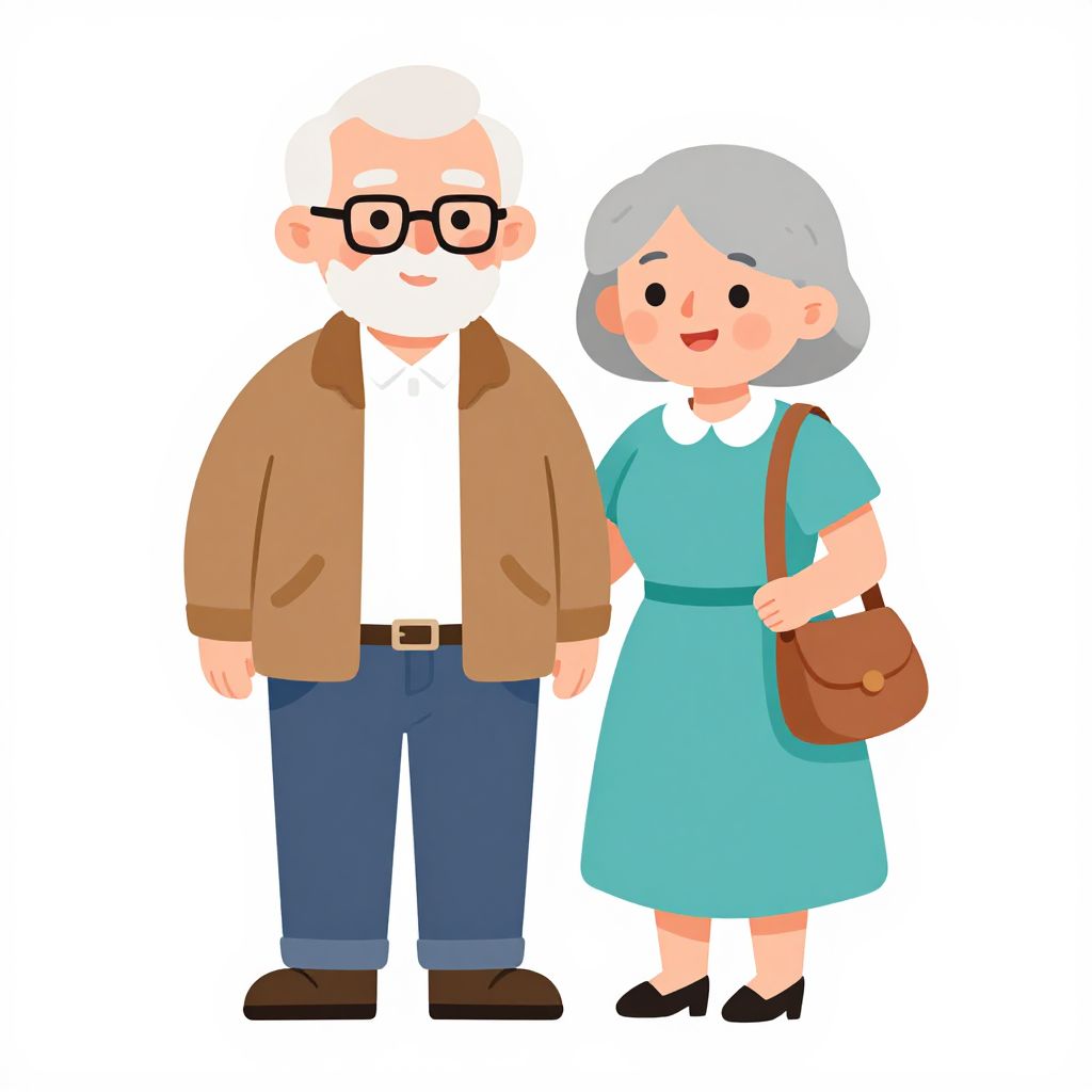 A vibrant cartoon-style illustration depicts a cheerful elderly couple, featuring a man in a brown jacket and white shirt paired with blue pants and shoes, alongside a woman in a teal dress carrying a brown shoulder bag, both rendered in bright, clean lines and soft pastel colors, embodying a modern and friendly aesthetic.
