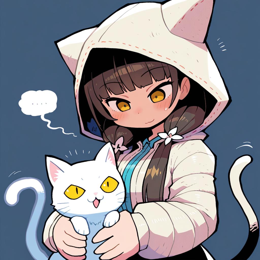 Asakura karen (heaven burns red), heaven burns red, 1girl, cat tail, yellow eyes, long hair, black hair, brown hair, low twintails, blunt bangs, hooded jacket, hood up, white cat, by artist rariatto (ganguri), illustrious