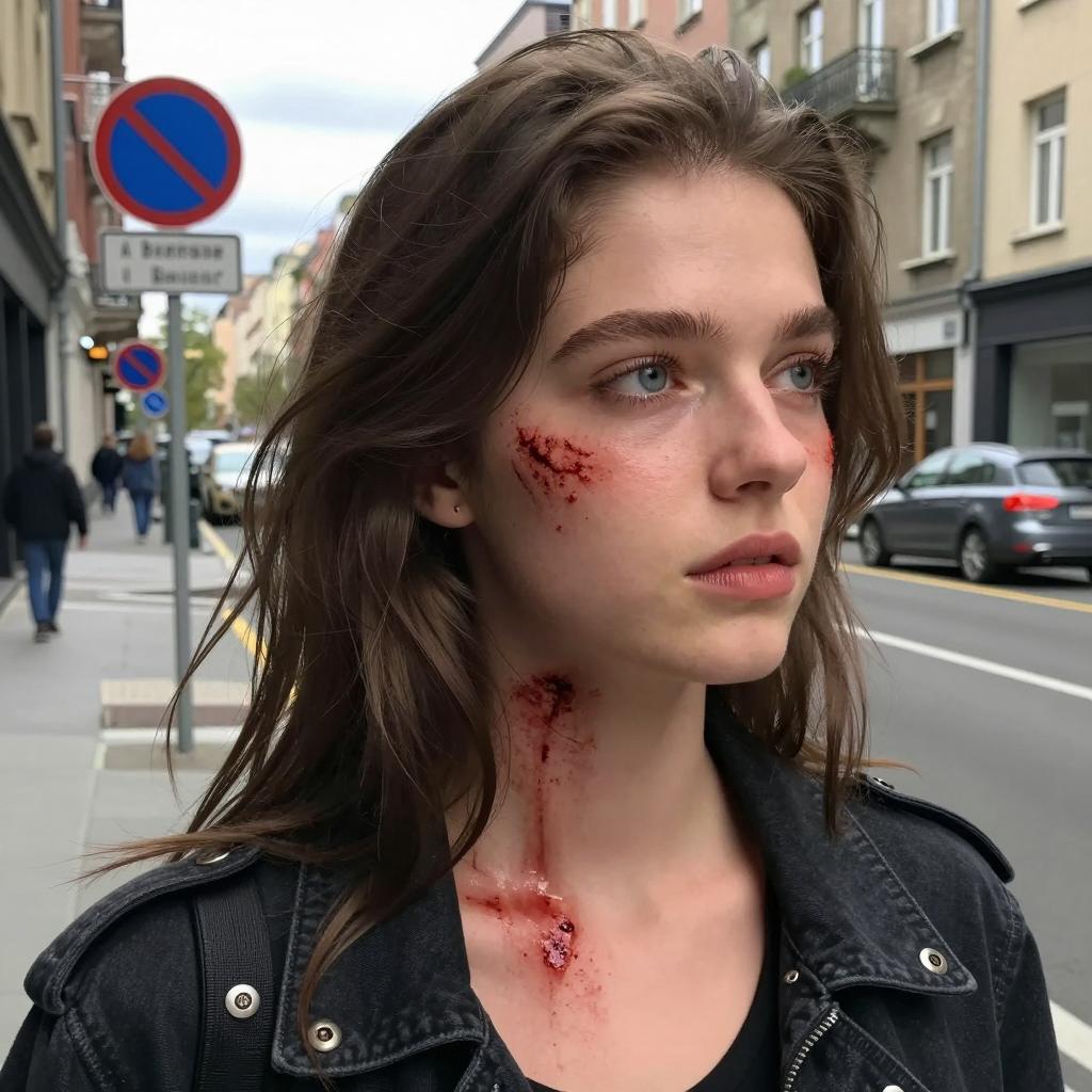 Close-up photograph of a woman with blood on her face and mouth, intense expression, brown curly hair, dark background.