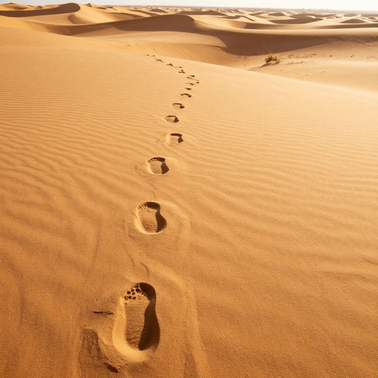Footprints etched deeply into golden sand stretch across a vast desert landscape, their intricate patterns weaving through undulating dunes under the warm glow of the sun.