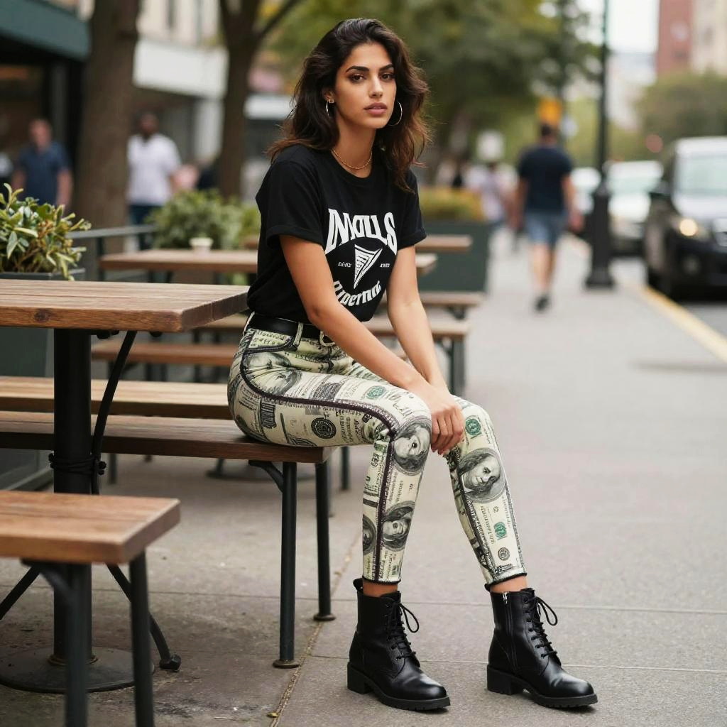 A Slim woman, in a street style aesthetic, wearing a black graphic t-shirt with white text and printed leggings featuring a currency design, paired with lace-up black ankle boots, sitting at sidewalk seating in a city park, captured in the visual style of a1 pictures. Sexy. Pretty face and beutiful eyes