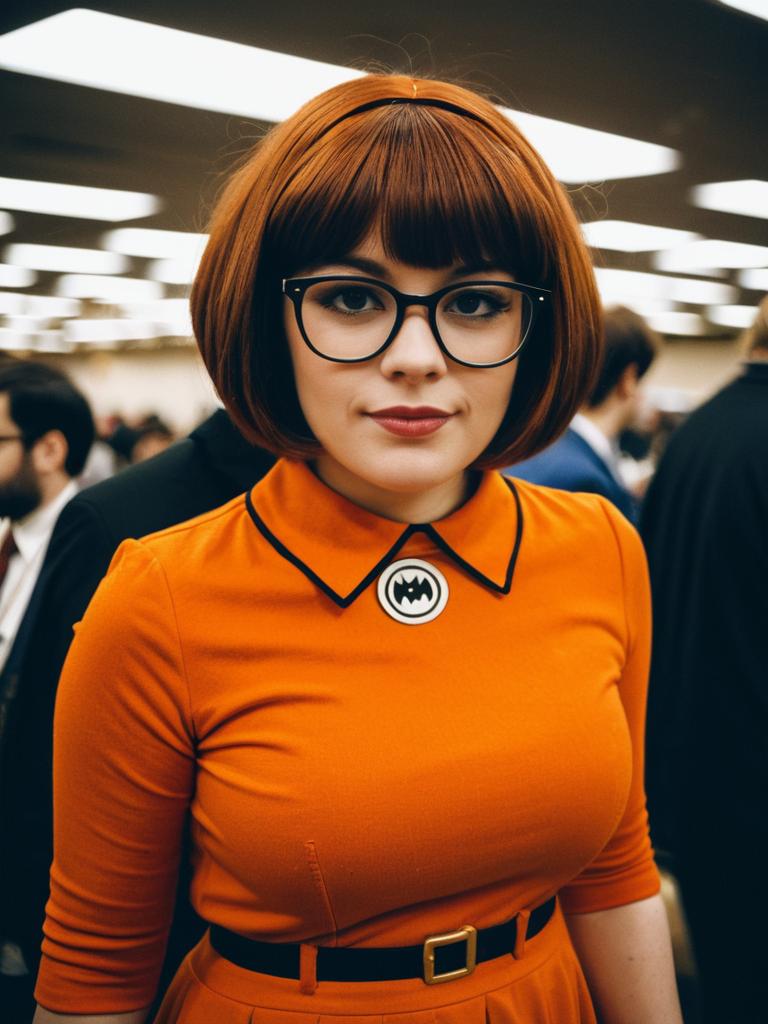 Woman in Velma Halloween Costume, candid cosplay portrait at convention