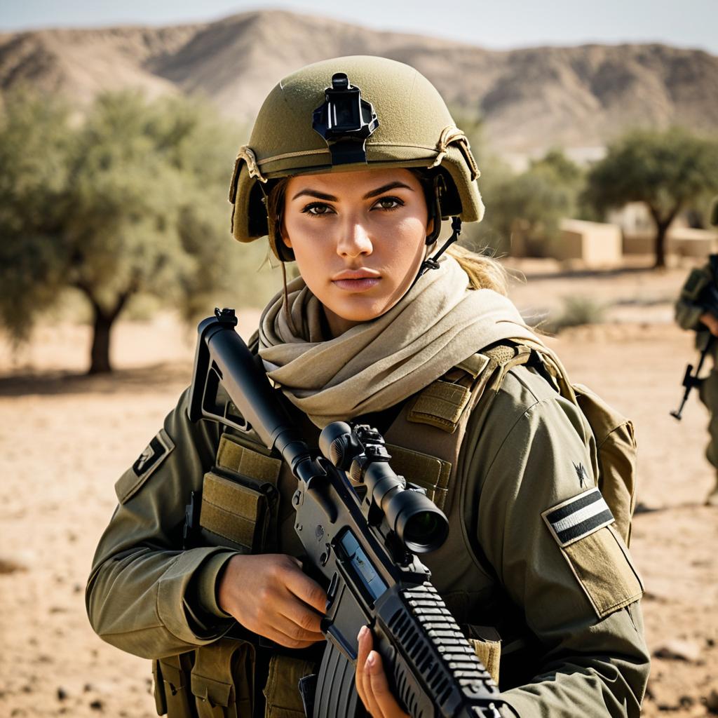 Israeli army costume, photorealistic CGI, female soldier, front view, desert environment, focused expression, olive green helmet with insignia, tan uniform, beige scarf, tactical vest with multiple pouches, black rifle with attached scope, blurred background with other soldiers, trees, and buildings, sunlight, serious demeanor, middle-distance, realistic ures, detailed clothing and equipment, military setting, daytime, focused lighting