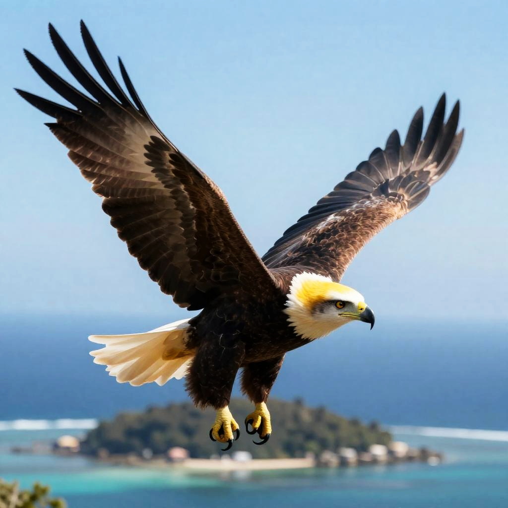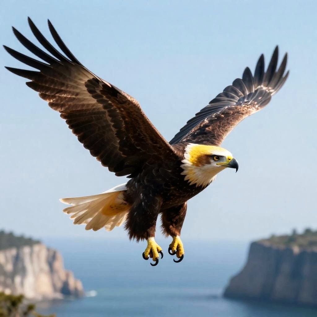 Chord An American eagle, full wing wide open flying, detailed colors, yellow head, Soaring over a Coastal Cliff with Waves, Crystal Clear Skies, Sense of Adventure, adorable animal photography, cute, well-lit, sharp-focus, high-quality, artistic, unique, Canon EOS 5D Mark IV DSLR, f/ 8, ISO 100, 1/ 250 second, close-up, natural light, domestic animals, playful, fluffy, Landscape style, no watermark,