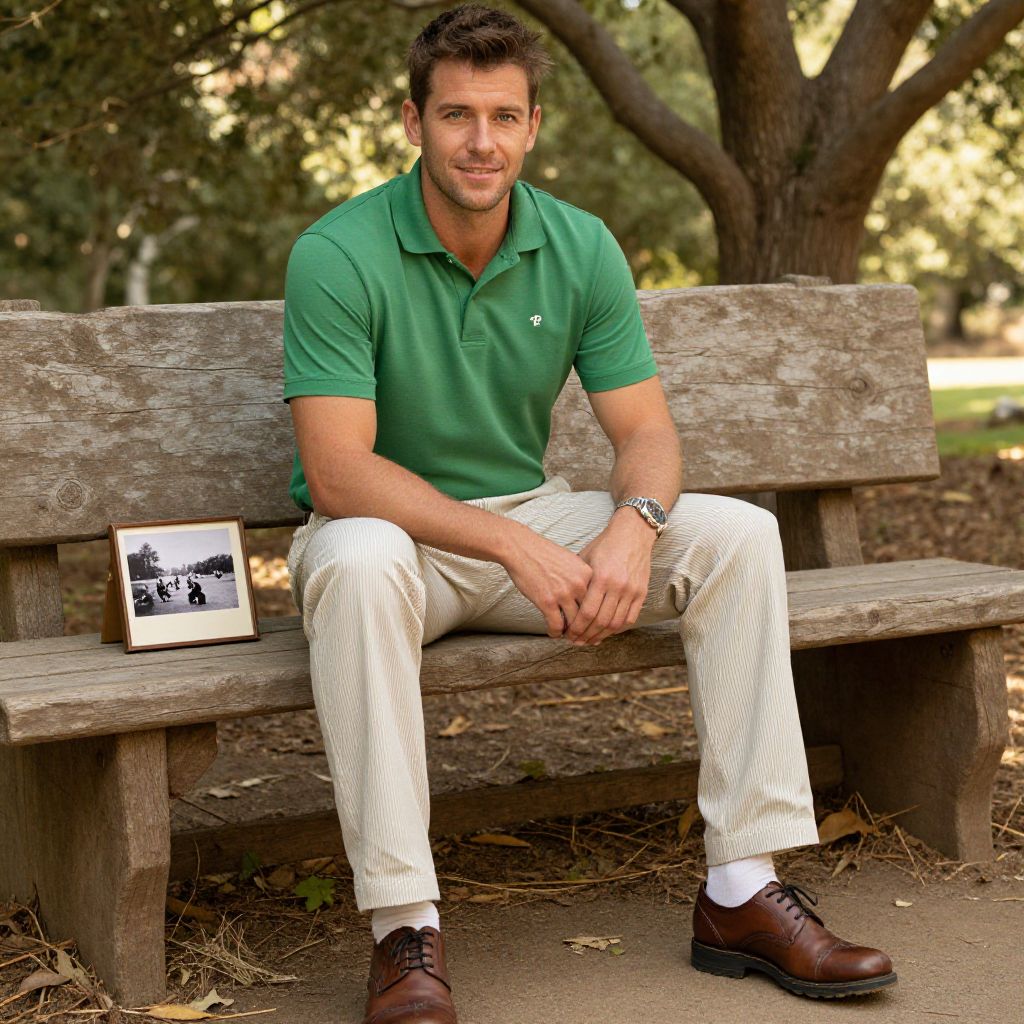 A man, green golf polo, beige pinstripe pants, brown golf shoes, rustic wooden benches, vintage photo, relaxed smile, warm sunlight filtering through trees Man has masculine face and piercing eyes