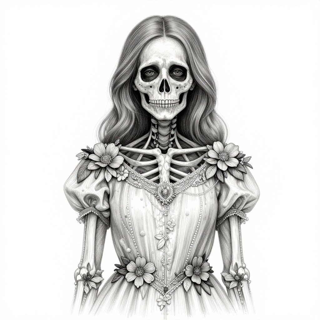 Digital black-and-white drawing of a female skeletal figure with long, wavy hair. She wears an ornate, Victorian-style dress adorned with large flowers on the shoulders, chest, and waist. The skeletal structure is detailed, with visible ribs and a collarbone. Her empty eye sockets and toothy grin add a haunting, eerie atmosphere. The dress features puffed sleeves and intricate lace patterns, enhancing the gothic aesthetic. The background is completely white, making the detailed, monochromatic figure the focal point of the image. The style combines elements of Gothic art and traditional Victorian fashion illustration.