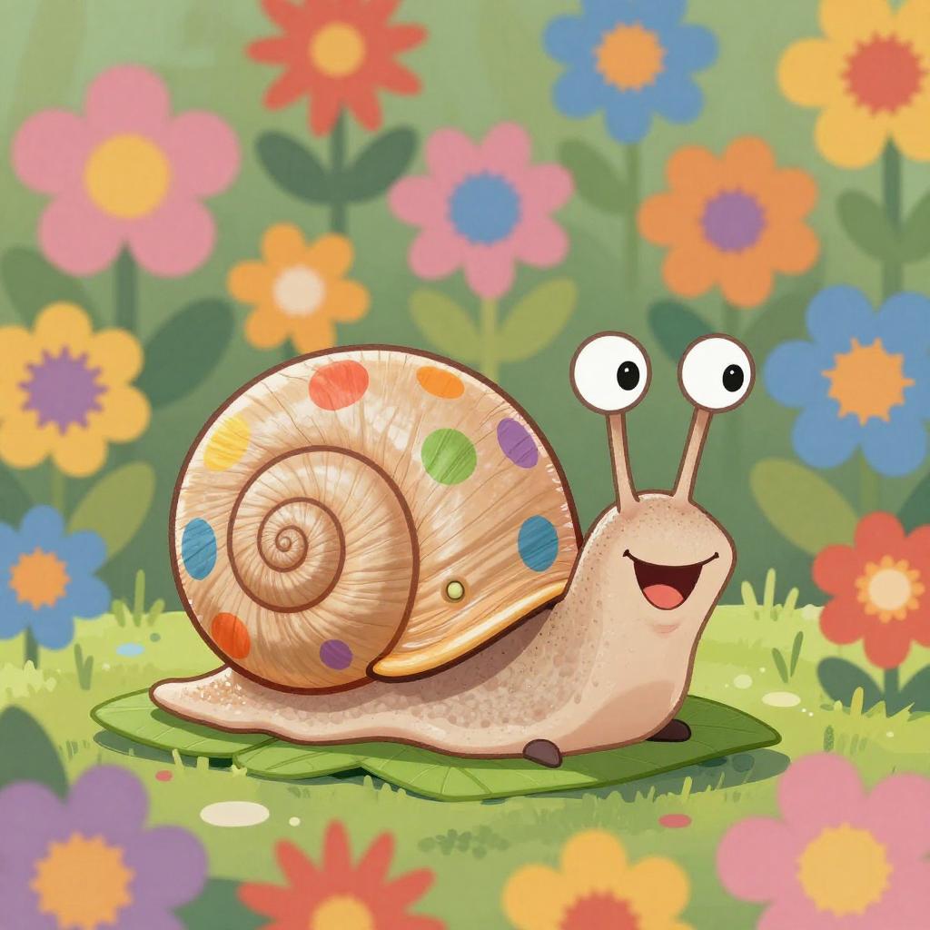 A quirky, colorful cartoon snail with eyes on stalks, a smiling mouth, arms, and legs, standing on a green leaf amidst a dense patch of vibrant, multicolored flowers. The snail's shell features a spiral pattern with bright dots and swirls, set against a lively and playful floral background in a whimsical cartoon style.