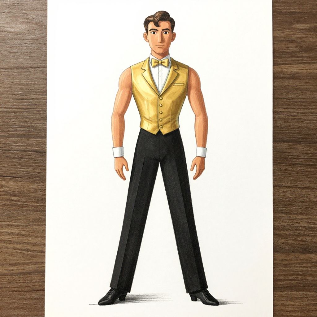 Latin Ballroom Costume Male Drawing, dressed in a golden vest and black pants
