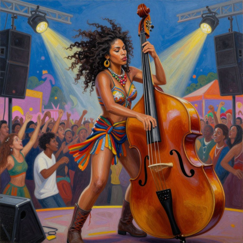 Digital painting of a vibrant Black woman with curly hair, wearing a colorful bikini and skirt, playing a large double bass on stage, surrounded by cheering,