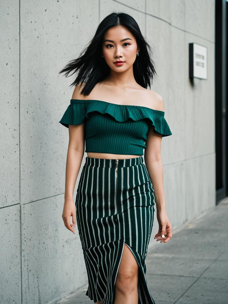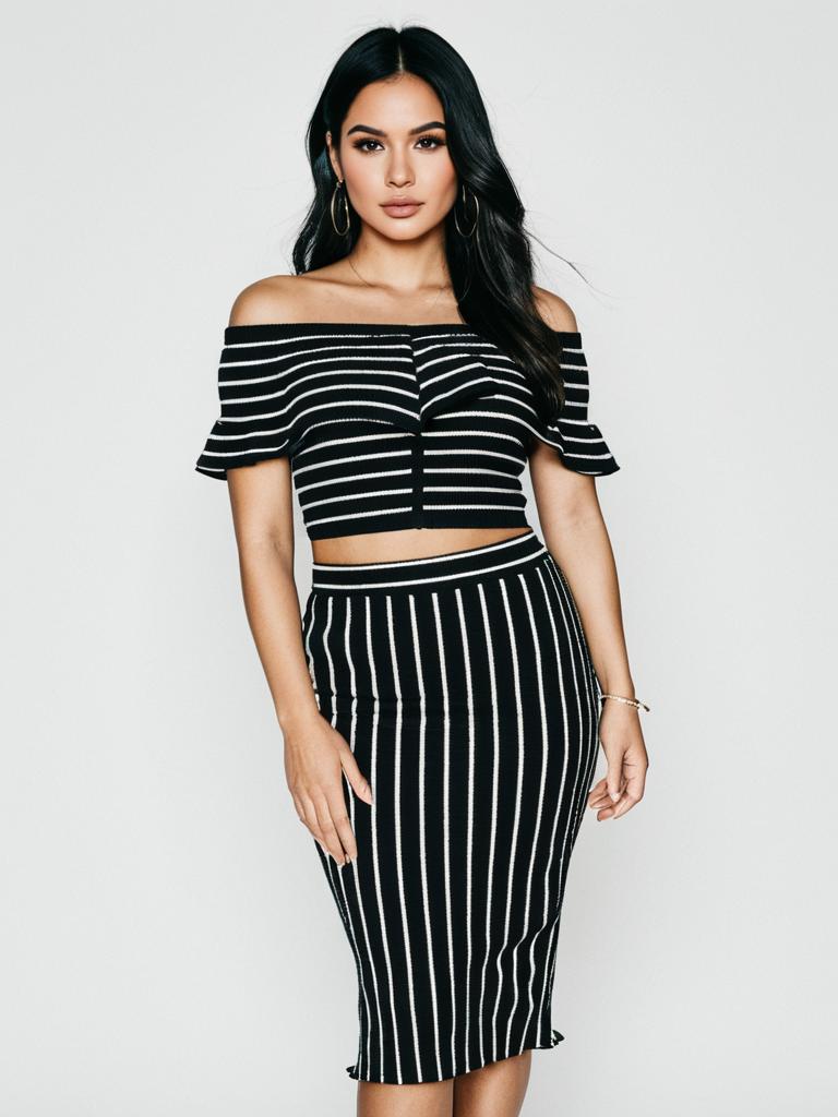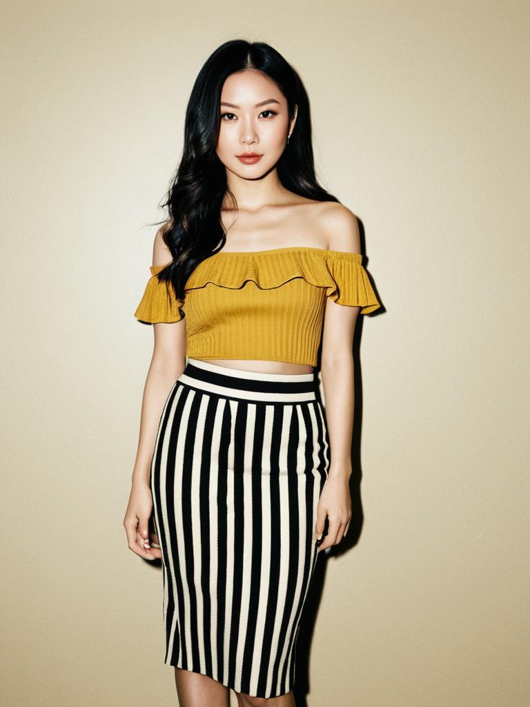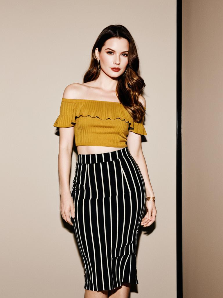 Woman wearing off-the-shoulder ruffled ribbed crop top and high-waisted vertical stripe midi pencil skirt with front slit in mustard yellow top with black-and-cream striped skirt on fair-skinned woman with straight chestnut hair and glossy lips posed standing casually with one hand resting by her side and the other near her waist, facing the camera in light taupe wall giving a warm neutral tone, cool white lighting evoking indoor club atmosphere, trendy night-out fashion photography, high resolution, ultra-detailed