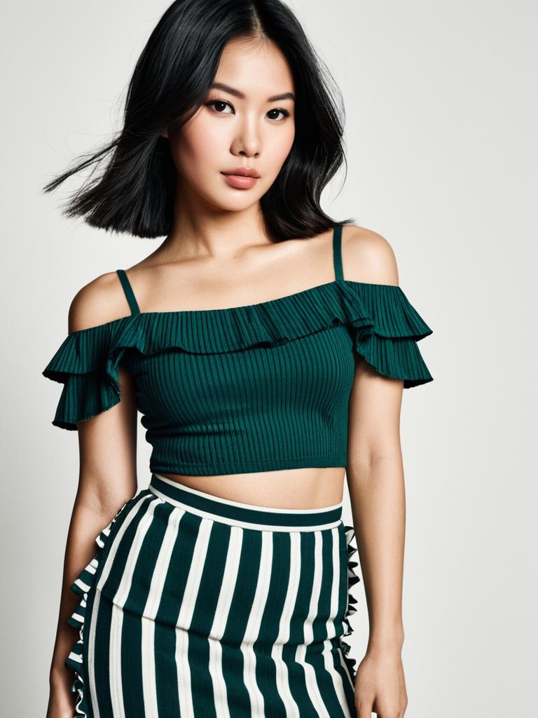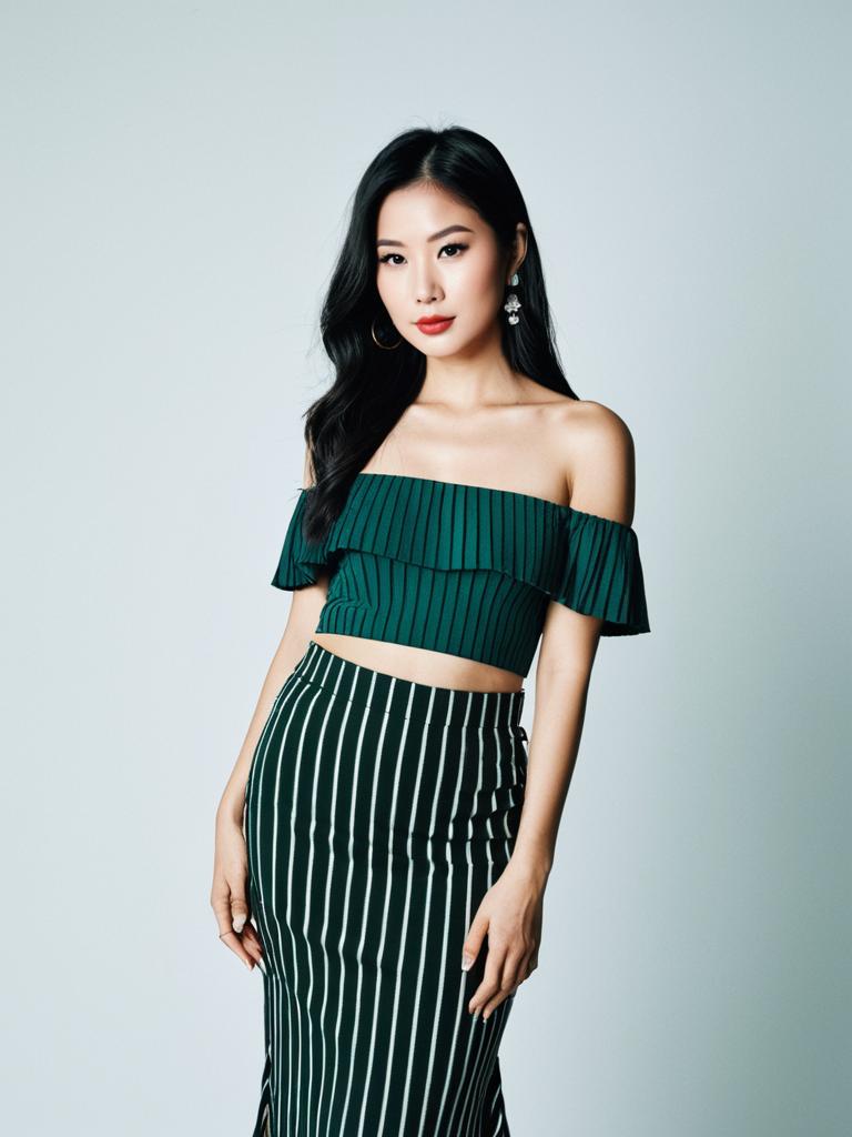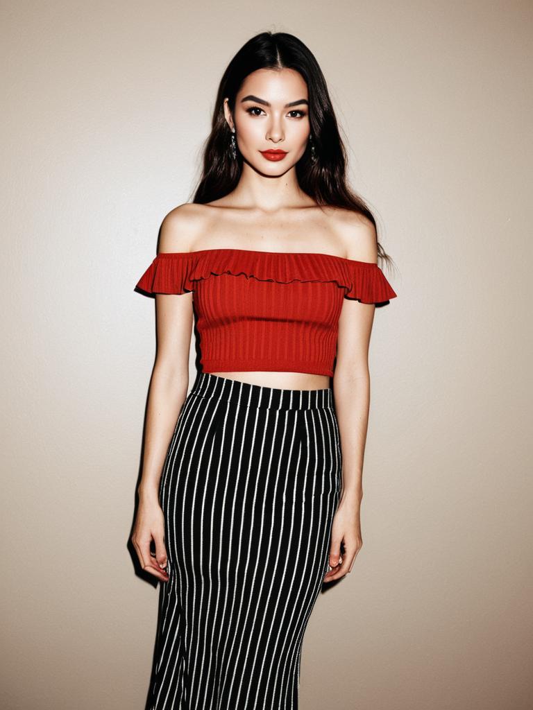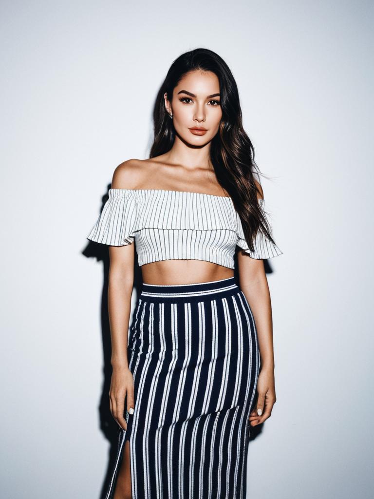 Woman wearing off-the-shoulder ruffled ribbed crop top and high-waisted vertical stripe midi pencil skirt with front slit in mustard yellow top with black-and-cream striped skirt on fair-skinned woman with straight chestnut hair and glossy lips posed standing casually with one hand resting by her side and the other near her waist, facing the camera in light taupe wall giving a warm neutral tone, cool white lighting evoking indoor club atmosphere, trendy night-out fashion photography, high resolution, ultra-detailed