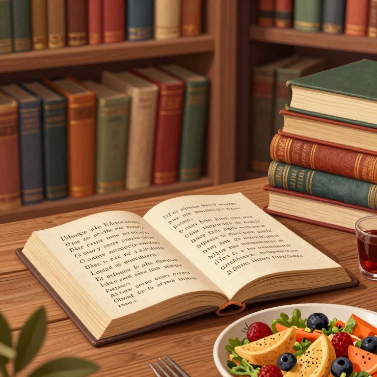 In a cozy, vintage-style library filled with colorful, antique books, an open book sits on a wooden table alongside a vibrant meal, evoking the whimsical idea of edible ink and sentences that transform into flavors and truths with each bite, captured in a high-definition, illustrative style.