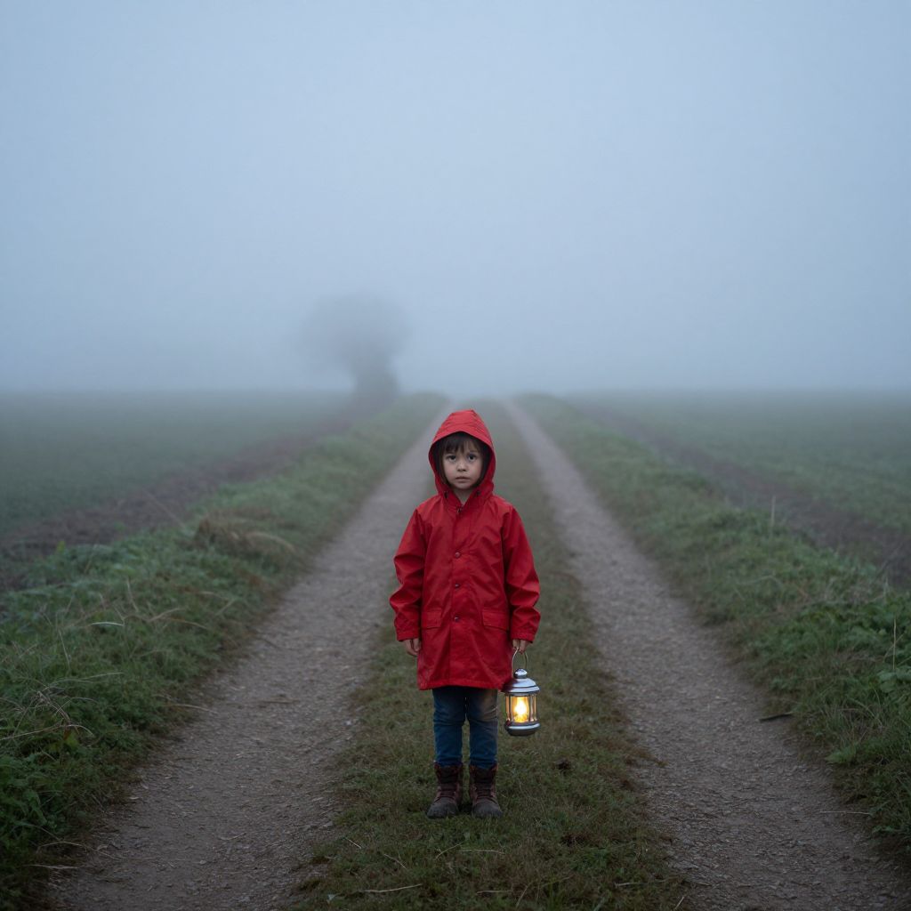 Photograph of a young child in a red raincoat, holding a lantern, standing on a misty, foggy dirt path in a grassy