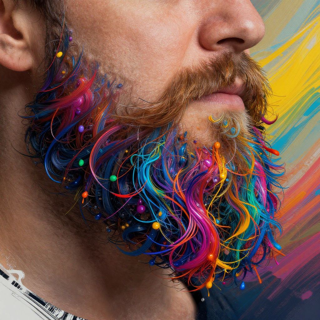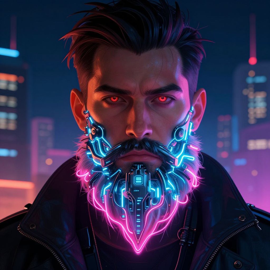 Photograph of a middle-aged man with a thick, wavy dark brown beard and mustache. His beard has a shiny, iridescent quality, reflecting colors. He has medium-length, slightly messy hair and is wearing a black jacket over a dark shirt. The background shows a blurred cityscape at dusk with neon lights and tall buildings. The lighting on his face creates a mix of blue, pink, and orange hues, adding a surreal, almost cyberpunk-like effect. His expression is neutral, with a focused gaze. The overall style combines realism with a futuristic, digital art influence.