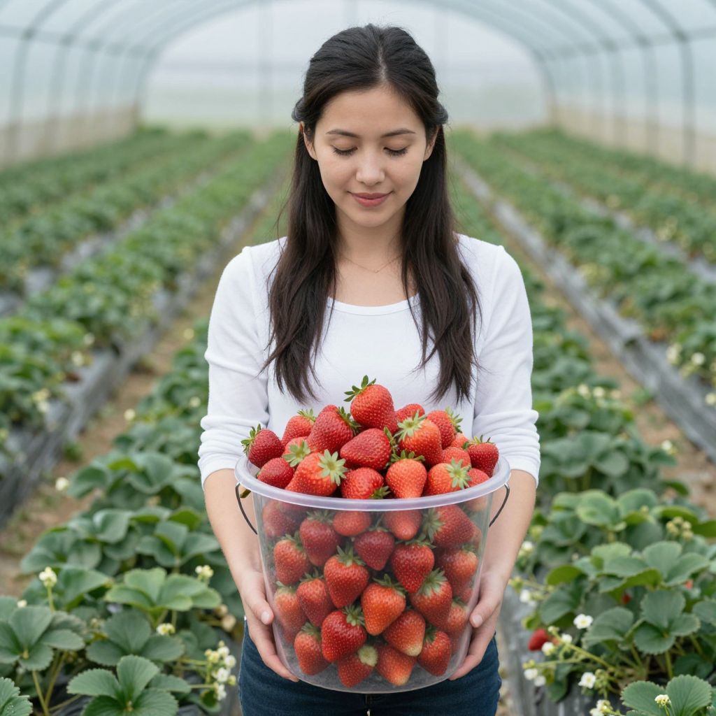 Photograph of a young woman with long, dark brown hair, wearing a white t-shirt, standing in a strawberry field. She is smiling softly while holding a clear plastic bucket filled with bright red strawberries. The bucket is held at chest level, and she looks down at it. The background shows rows of green strawberry plants with small white flowers, extending into the distance under a slightly blurred, light blue sky. The woman's skin is fair, and she appears to be of Caucasian ethnicity. The image is brightly colored, highlighting the vivid red of the strawberries and the lush green of the plants.