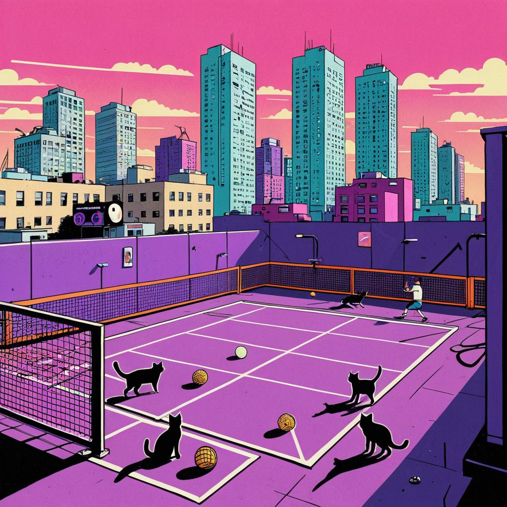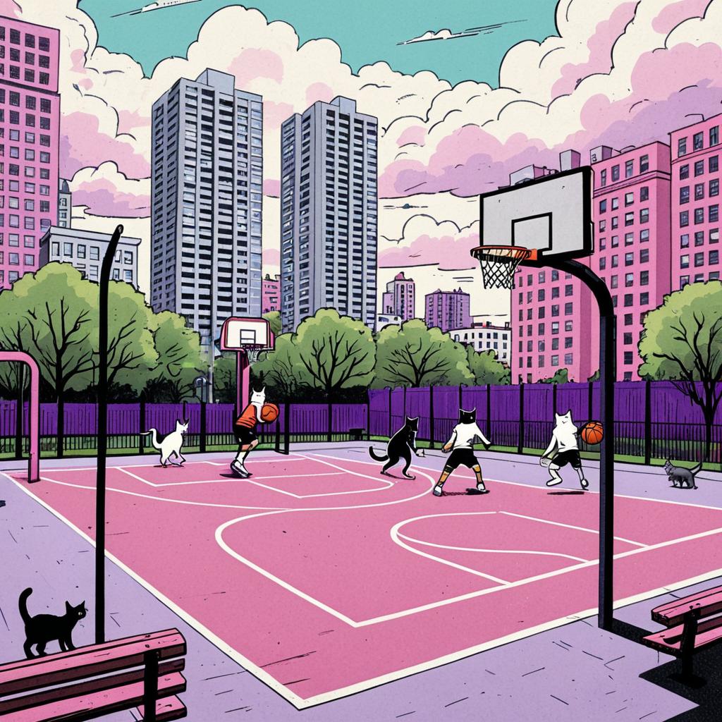 Comic book style illustration of cats playing basketball on a cloudy afternoon, street court in a city park, pastel colors. Background includes tall buildings, pink and purple fence, bench with boombox, dynamic and spirited