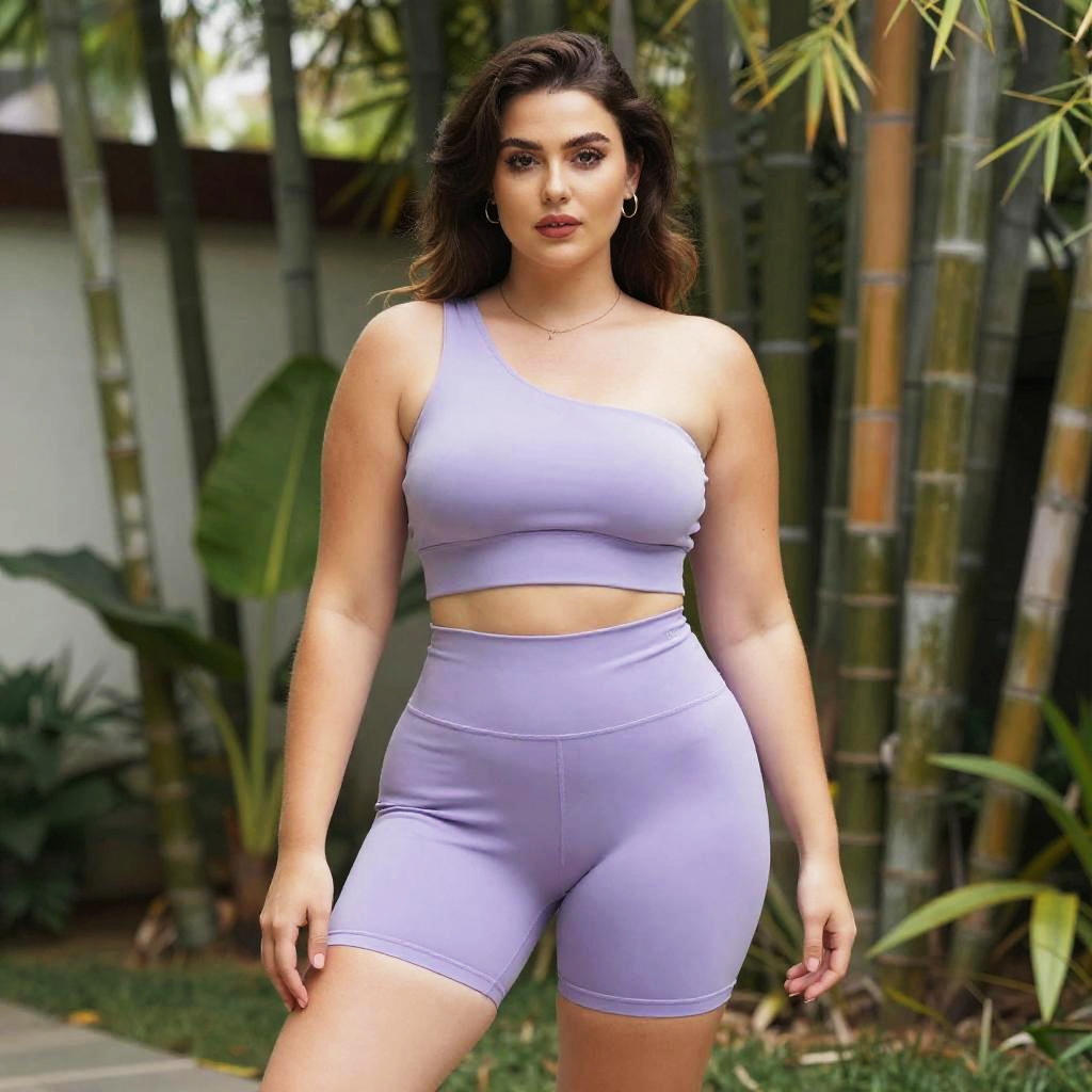 A lanky woman in a lavender two-piece workout set, featuring a one-shoulder sports bra and high-waisted cycling shorts, stands in a tropical garden with a bamboo grove, embodying a dark horse visual style. Sexy. Pretty face and beutiful eyes