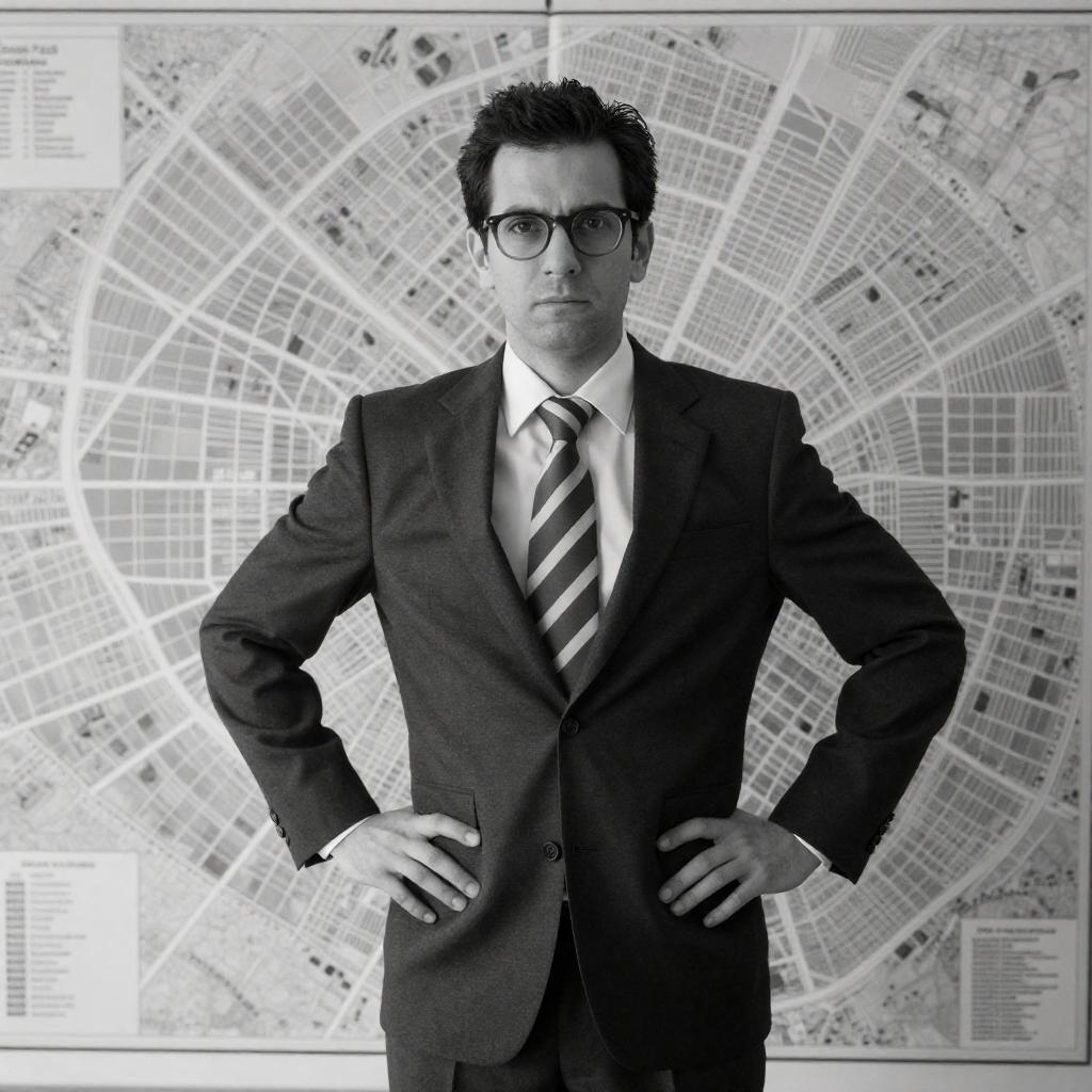 Photograph of a man with short dark hair, glasses, and a serious expression, wearing a dark suit and striped tie. He stands with hands on hips in front of a large, detailed black-and-white city map. Map fills the background, showing intricate street patterns and landmarks. Man is centered, slightly leaning forward.