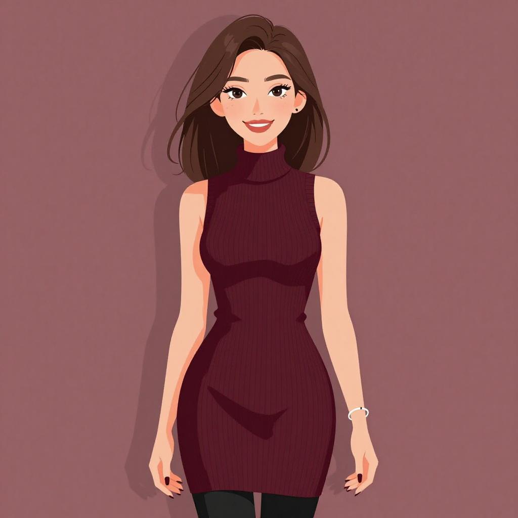 Woman with pretty face and pretty hair. smiling Woman, chic, sleeveless turtleneck sweater in ribbed burgundy fabric, fitted silhouette, hip-length, paired with black leggings, minimal jewelry with a thin silver bangle, dark manicure. --sref 1467
