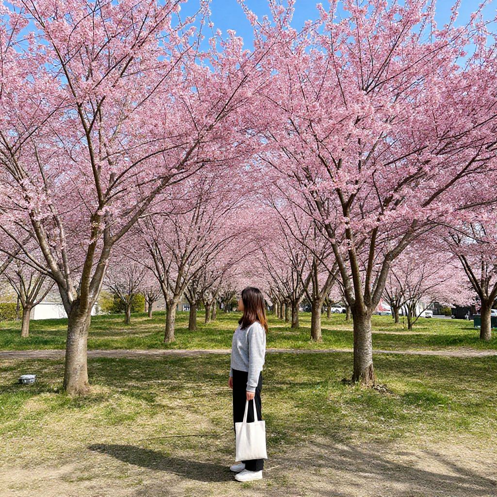 Woman standing amidst rows of vibrant pink cherry blossom trees in full bloom, holding a white tote bag, with a backdrop of neatly trimmed grass and a clear blue sky in Markham.