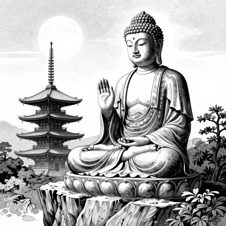 A detailed black and white illustration of a Buddha statue sitting on a cliff, with a pagoda in the background and a full moon in the sky, created in the style of Hokusai and Moebius.