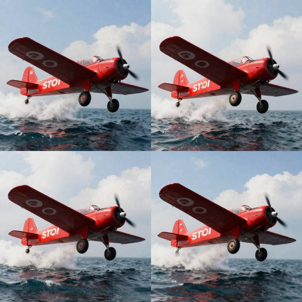 This image is a digital collage featuring four action-packed photographs of a bright red, vintage-style airplane taking off and landing over a turbulent ocean. The planes are silhouetted against dramatic, splash-filled backgrounds with vivid blue and white hues. Each shot captures dynamic motion and energy, with the top-right and bottom-left photos showing the plane ascending, and the top-left and bottom-right shots showing it descending, creating a sense of thrilling movement.