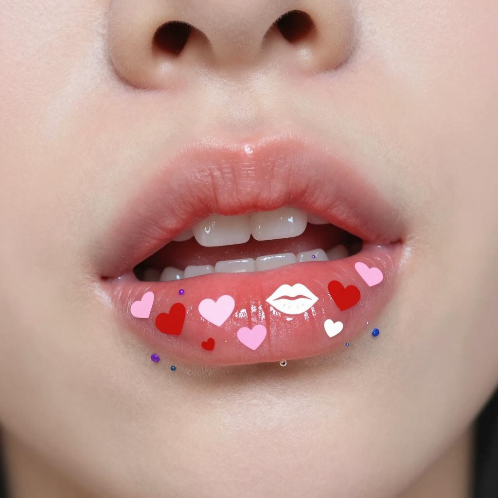 Close-up photograph of a person's lips. Lips are slightly parted, covered in pink and red lipstick. Various small, colorful heart shapes and lip illustrations in pink, red, and white are dotted across the lips. Tiny blue and purple beads are scattered along the top and bottom lip lines. Skin is light and smooth. The lip illustrations and hearts are digitally added.