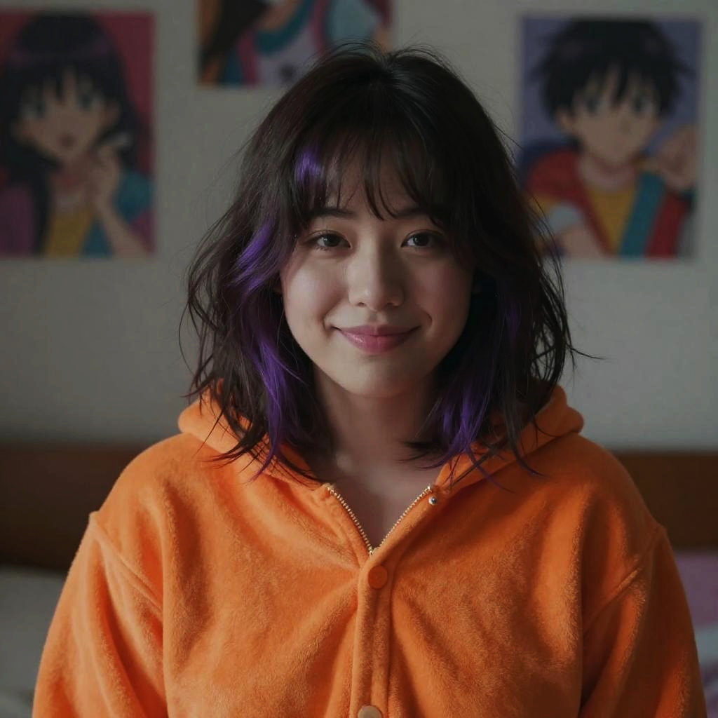 Raw photo, upper body photo, a cute anime fan, (canadian, mexican:0.9), [two-toned purple, brunette hair color| messy hair cut, mid-lenght:15], 21yo, sweet, (portly body, innocent:0.7), realistic skin texture, (wearing an orange anime onesie:1.1), softcore, (dimly lit, night, dark, moody atmosphere:0.9), (happy:0.5), instagram style, (girly bedroom, anime posters:1.1), highly detailed photography, (muted colors, cinematic, dim colors, soothing tones:1.2), vibrant, insanely detailed, hyperdetailed, (dark shot:1.2), (vsco:0.3), 75mm