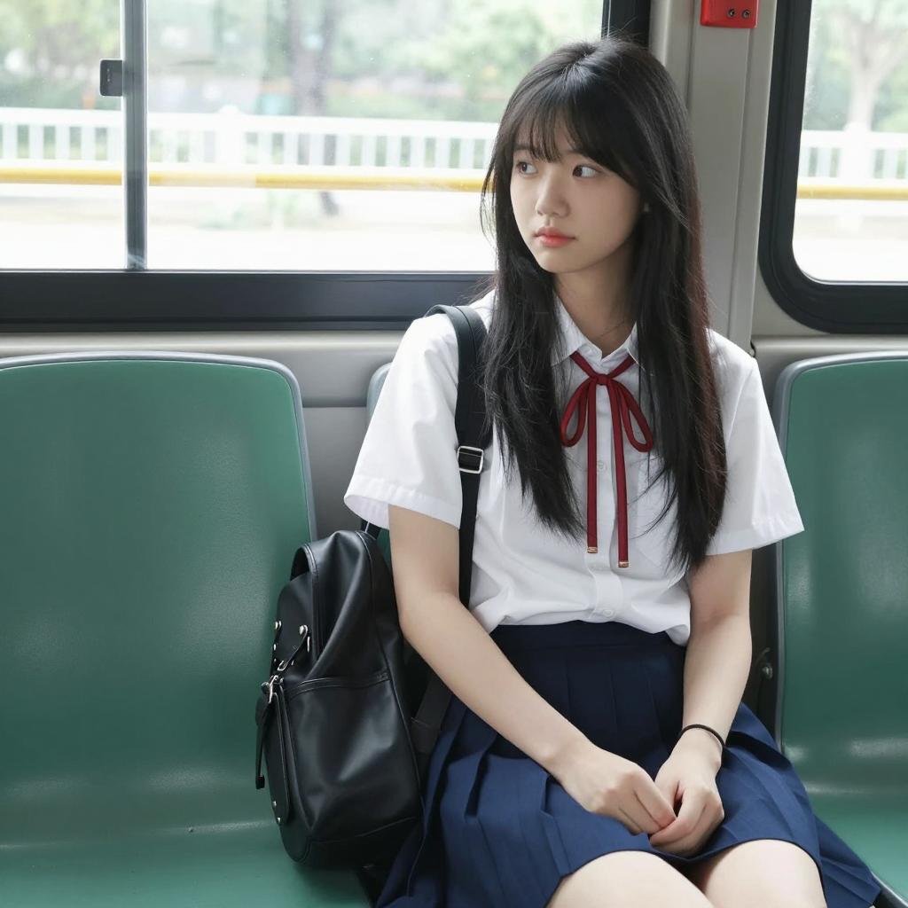 Asian woman with long black hair sitting on a green bus seat, wearing a white short-sleeve shirt with red ribbon, blue pleated skirt, and blue suspenders. Black backpack on her left. Windows in the background. She looks to the right, expression neutral. Light streams in from the windows. Photo.