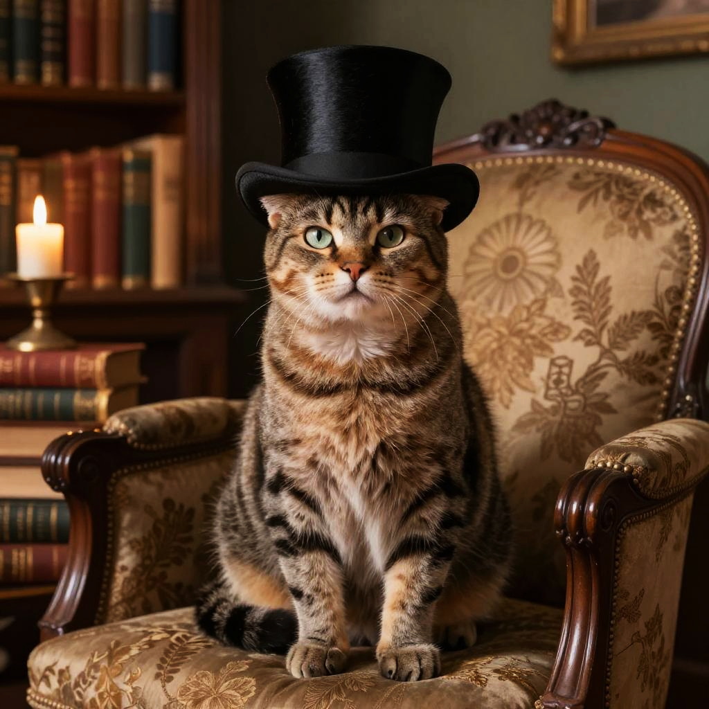 Cat wearing top hat sitting elegantly on a Victorian armchair, surrounded by antique books and warm candlelight, highly detailed, rich textures, realistic fur and fabric, cozy library setting, soft shadows