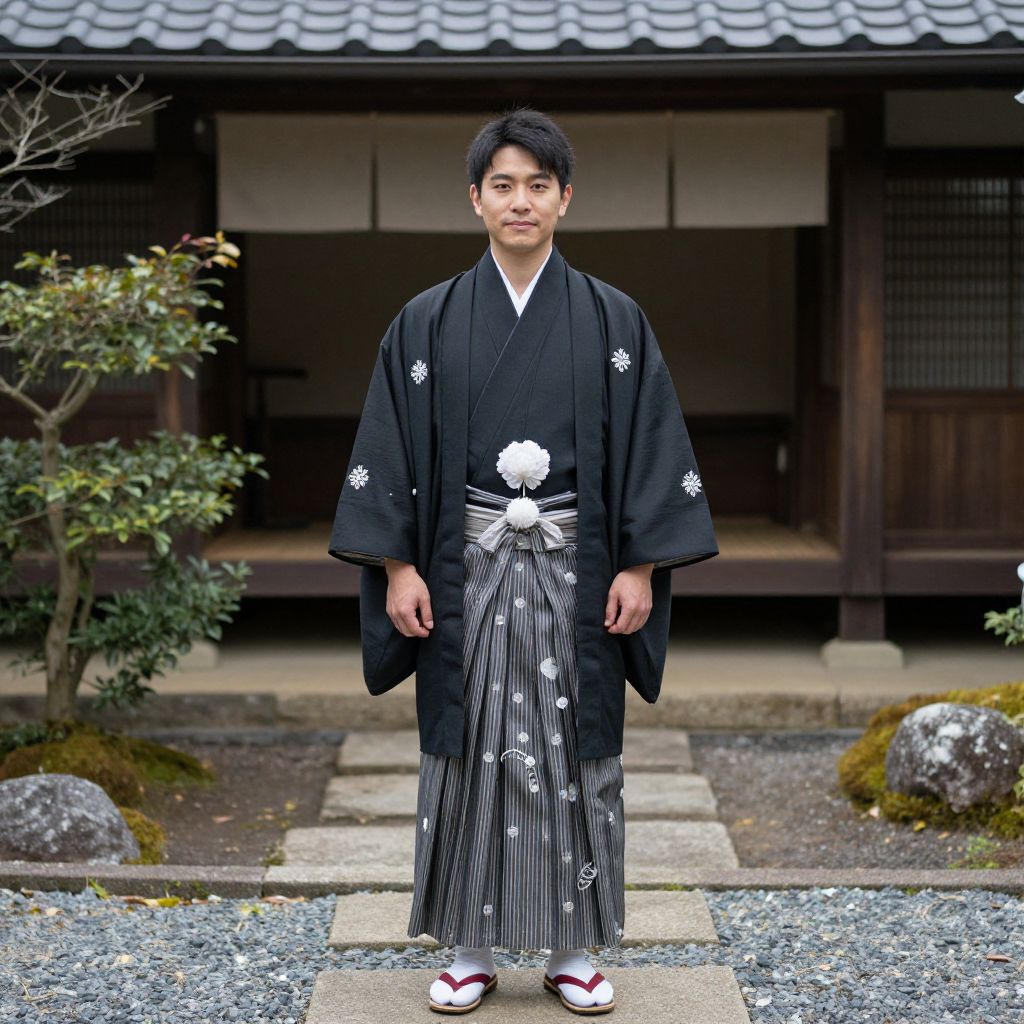 Asian man wearing traditional Japanese wedding attire, including a black kimono jacket and striped hakama pants with decorative patterns, standing in a Japanese garden with stone pathway and wooden building in the background.