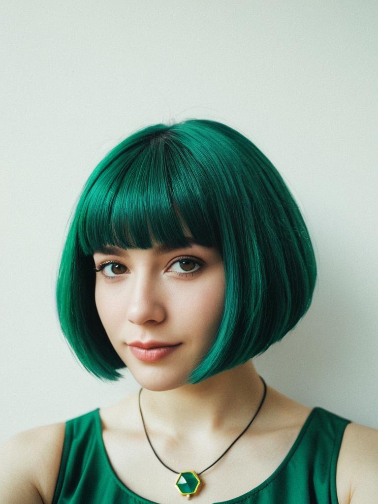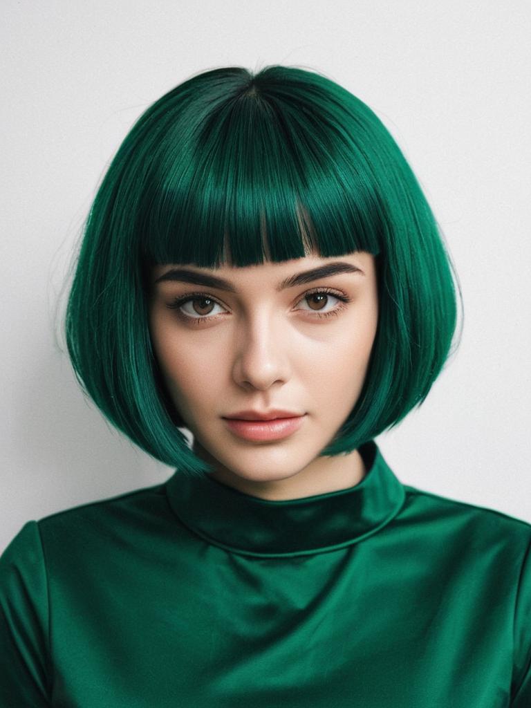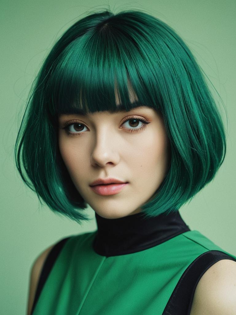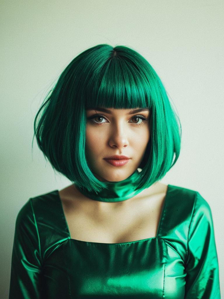 Woman in Emerald Green Bob Hairstyle costume, cosplay editorial photography, realistic tones