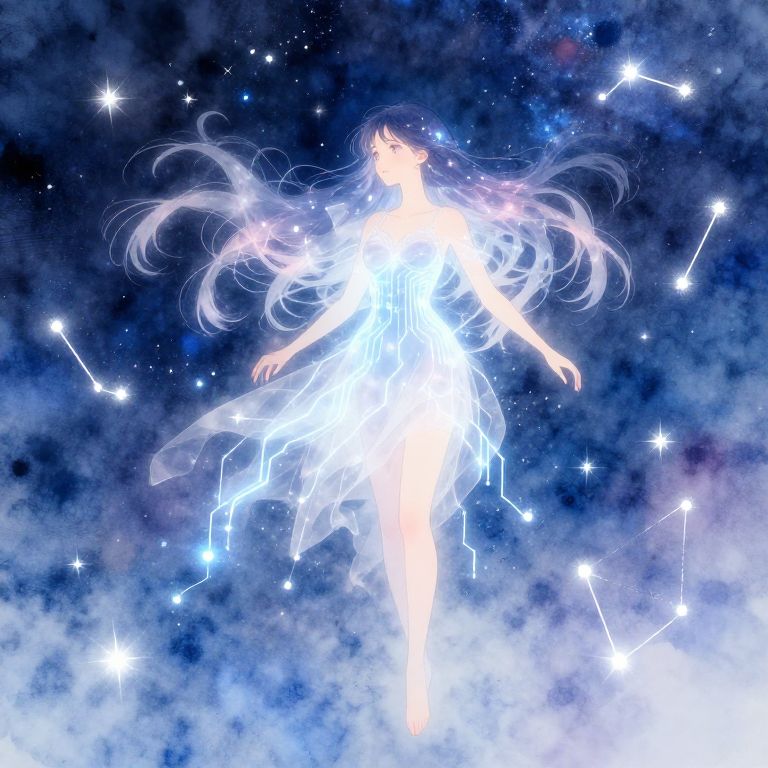 Digital anime-style illustration of a glowing, ethereal woman with long, flowing hair, surrounded by stars and constellations in a cosmic, cloudy sky