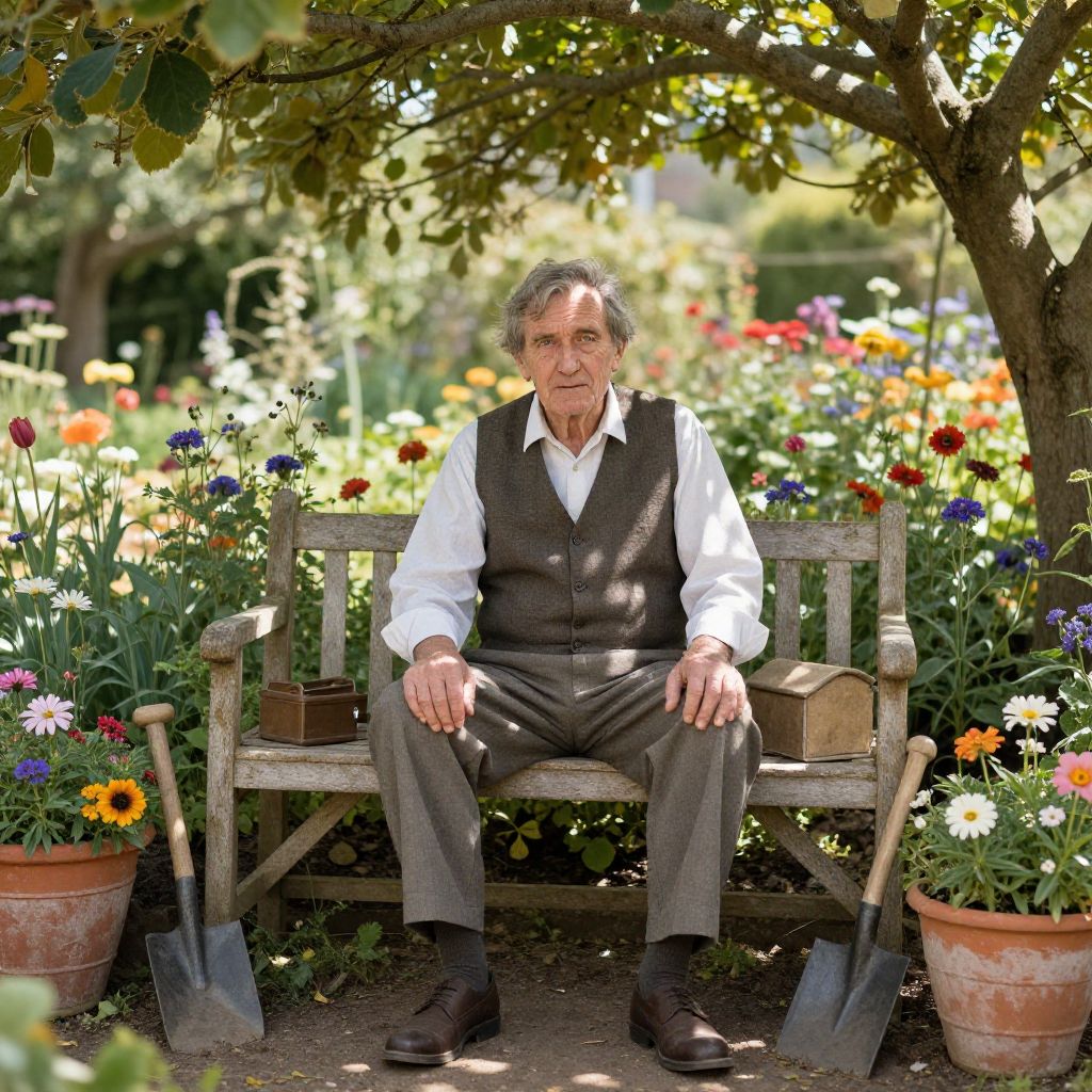 Photograph of an elderly man with gray hair, wearing a white shirt and gray vest, sitting on a wooden bench in a vibrant, sunlit garden