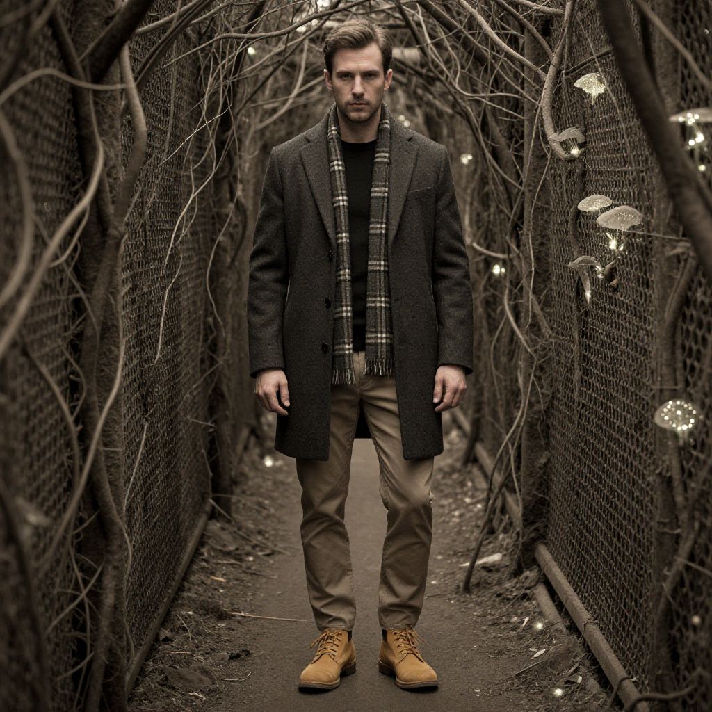 A man, sophisticated charcoal wool overcoat, plaid wool scarf, fitted black crewneck sweater, slim-fit khaki trousers, tan leather desert boots, narrow passageways, tangled roots breaking through, faint glow of bioluminescent fungi, sepia effect, contemplative expression. Man has masculine face and piercing eyes